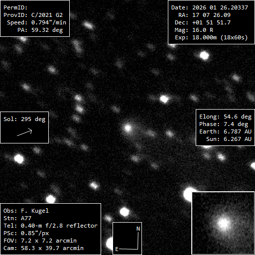(Copyright Francois Kugel)Nuclear magnitude (m2) 16 m2 standard deviation 0.1 Aperture radius used for m2 5.95 " r (dist/Sun) 6.266 AU d (dist/Earth) 6.788 AU Right ascension 17 07 25.90 h m s Declination +01 51 49.5 ° ' " MPC report COD A77