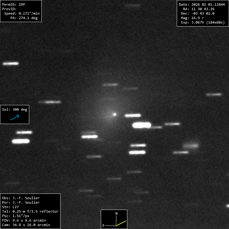 (Copyright Jean-Francois Soulier)Nuclear magnitude (m2) 17 m2 standard deviation 0.2 Aperture radius used for m2 6.75 " r (dist/Sun) 6.308 AU d (dist/Earth) 5.556 AU Right ascension 11 30 44.43 h m s Declination -03 43 03.2 ° ' " MPC report COD L27