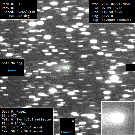 (Copyright Francois Kugel)Nuclear magnitude (m2) 16.9 m2 standard deviation 0.1 Aperture radius used for m2 5.95 " r (dist/Sun) 4.315 AU d (dist/Earth) 3.564 AU Right ascension 07 09 16.45 h m s Declination +19 50 45.9 ° ' " MPC report COD A77
