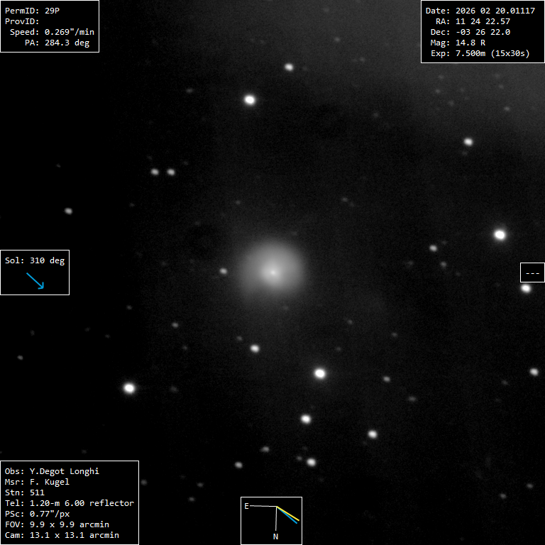 (Copyright Francois Kugel)Coma Total magnitude (m1) 11.2 Nuclear magnitude (m2) 15.4 m2 standard deviation 0.9 Aperture radius used for m2 4.23 " Coma diameter 2.4 ' Afrho 8103 cm Afrho error 455 cm Right ascension 11 24 22.60 h m s Declination -03 26 22.3 ° ' " MPC report COD 511