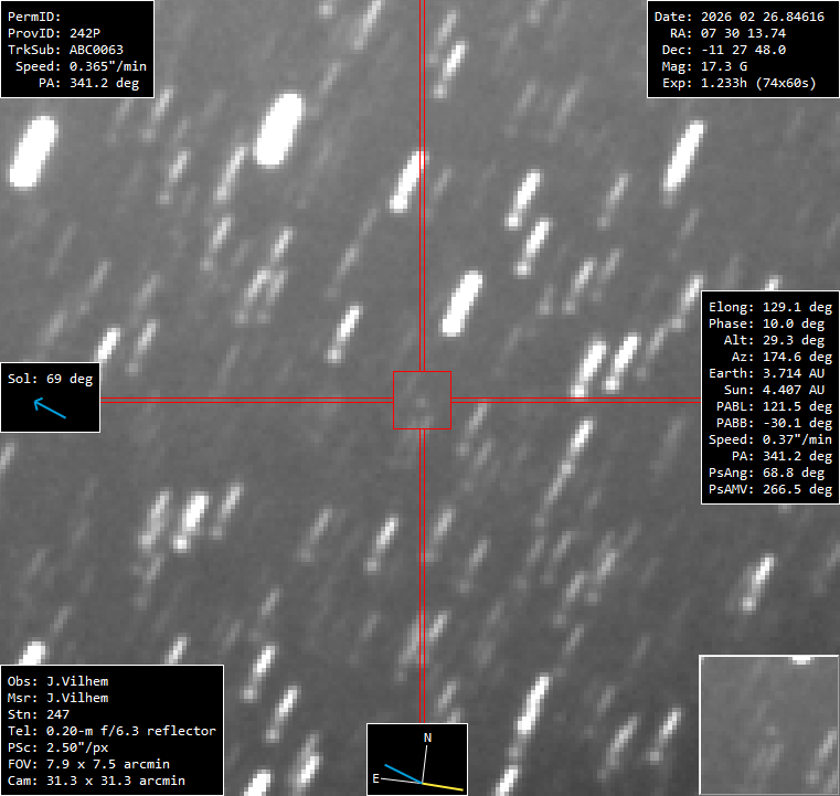 (Copyright Jonathan Vilhem)Nuclear magnitude (m2) 17.3 r (dist/Sun) 4.405 AU d (dist/Earth) 3.706 AU Right ascension 07 30 13.74 h m s Declination -11 27 48.0 ° ' " Instrument CELESTRON C8 Instrument type Schmidt-Cassegrain Instrument aperture (0=naked eye) 203 mm Instrument focale length 2032 mm Instrument focale/diameter 10.0 Filter(s) None Camera ASI 533 MM PRO Sensor CMOS Sensor size 11.31X11.31 mm2 Sensor pixels number 3008X3008 Sensor temperature -10 °C Binning 4x4 Mount EQ6R PRO Motorization Yes Autoguide No Exposure total time 4440 s Exposure details 74x60s Seeing 3 Observatory MPC code 247 Location Saint Jean Rohrbach Moselle France Reference stars catalog Tycho Used softwares TYCHO Remarks or comments Lune déjà bien présente. Observation submission date 2026 Feb 28 11h55m42s