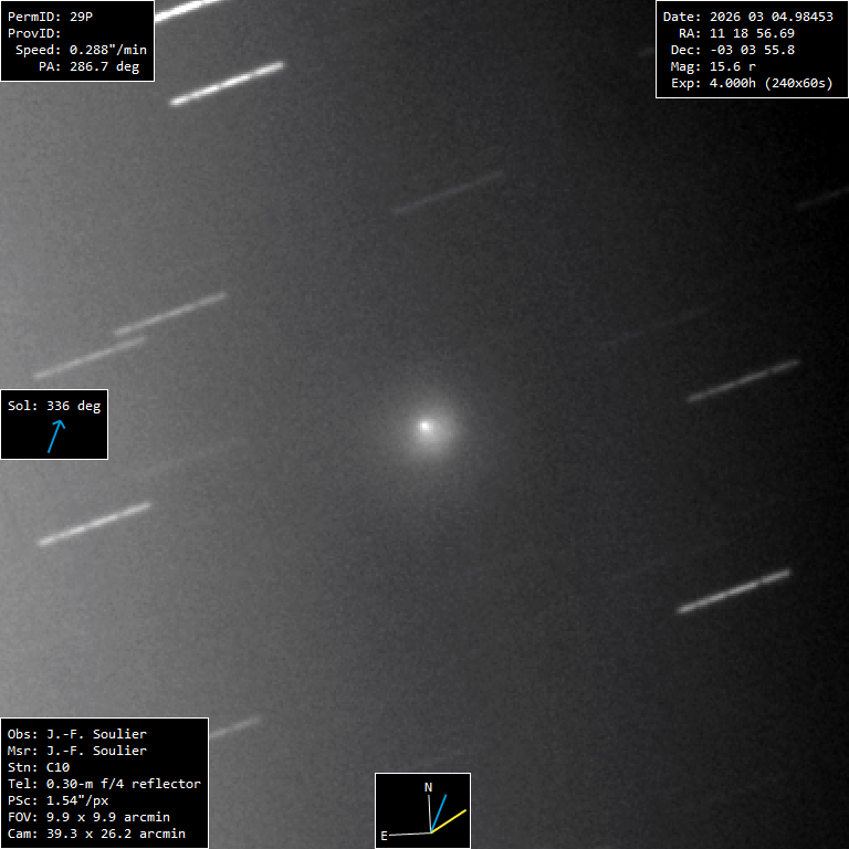 (Copyright Jean-Francois Soulier)Nuclear magnitude (m2) 15.6 m2 standard deviation 0.1 Aperture radius used for m2 6.97 " r (dist/Sun) 6.311 AU d (dist/Earth) 5.335 AU Right ascension 11 18 59.22 h m s Declination -03 04 07.9 ° ' " MPC report COD C10