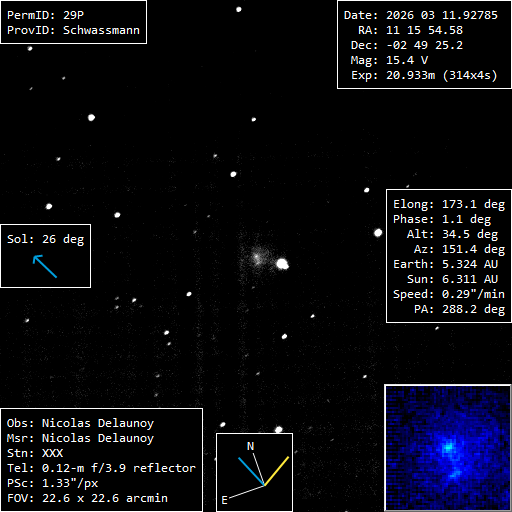 (Copyright Nicolas Delaunoy)Nuclear magnitude (m2) 15.4 Aperture radius used for m2 6.1 " r (dist/Sun) 6.311 AU d (dist/Earth) 5.324 AU Right ascension 11 15 54.58 h m s Declination -02 49 25.2 ° ' " Instrumental configuration Config1 Instrument UNISTELLAR eQuinox2 Instrument type Newton Instrument aperture (0=naked eye) 115 mm Instrument focale length 450 mm Instrument focale/diameter 3.91 Filter(s) None Camera IMX347 Sensor CMOS Sensor size 7.1x5.3 mm2 Sensor pixels number 2088x1536 Binning 1x1 Mount ALT-AZ Motorization Yes Autoguide No Exposure total time 1256 s Exposure details 314x4s Sky transparency (naked eye max mag) 4 Seeing 3 Moon phase 96 ° Moon elongation 95 ° Location Yerres, 91330, France Reference stars catalog UCAC-4 Used softwares Tycho tracker V13.02 master darks avec Siril) Resulting picture sampling (scale) 1.33 "/pix Observation submission date 2026 Mar 12 17h11m05s Observation modification date 2026 Mar 12 17h12m52s