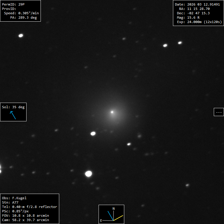 (Copyright Francois Kugel)Nuclear magnitude (m2) 15.8 m2 standard deviation 0.1 Aperture radius used for m2 6.93 " r (dist/Sun) 6.311 AU d (dist/Earth) 5.324 AU Right ascension 11 15 28.86 h m s Declination -02 47 15.9 ° ' " MPC report COD A77