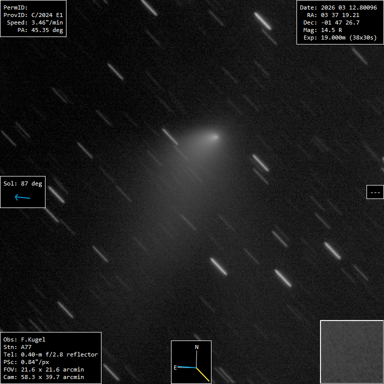 (Copyright Francois Kugel)Coma Total magnitude (m1) 8.6 Aperture radius used for m1 2 ' Nuclear magnitude (m2) 14.5 m2 standard deviation 0.0 Aperture radius used for m2 5.95 " Afrho 944 cm Afrho error 37 cm r (dist/Sun) 1.189 AU d (dist/Earth) 1.278 AU Right ascension 03 37 18.67 h m s Declination -01 47 34.8 ° ' " MPC report COD A77