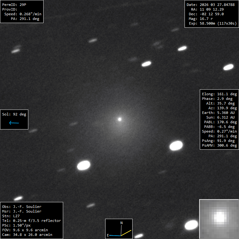 (Copyright Jean-Francois Soulier)Nuclear magnitude (m2) 16.8 m2 standard deviation 0.0 Aperture radius used for m2 6.75 " r (dist/Sun) 6.312 AU d (dist/Earth) 5.356 AU Right ascension 11 09 12.78 h m s Declination -02 13 01.7 ° ' " MPC report COD L27