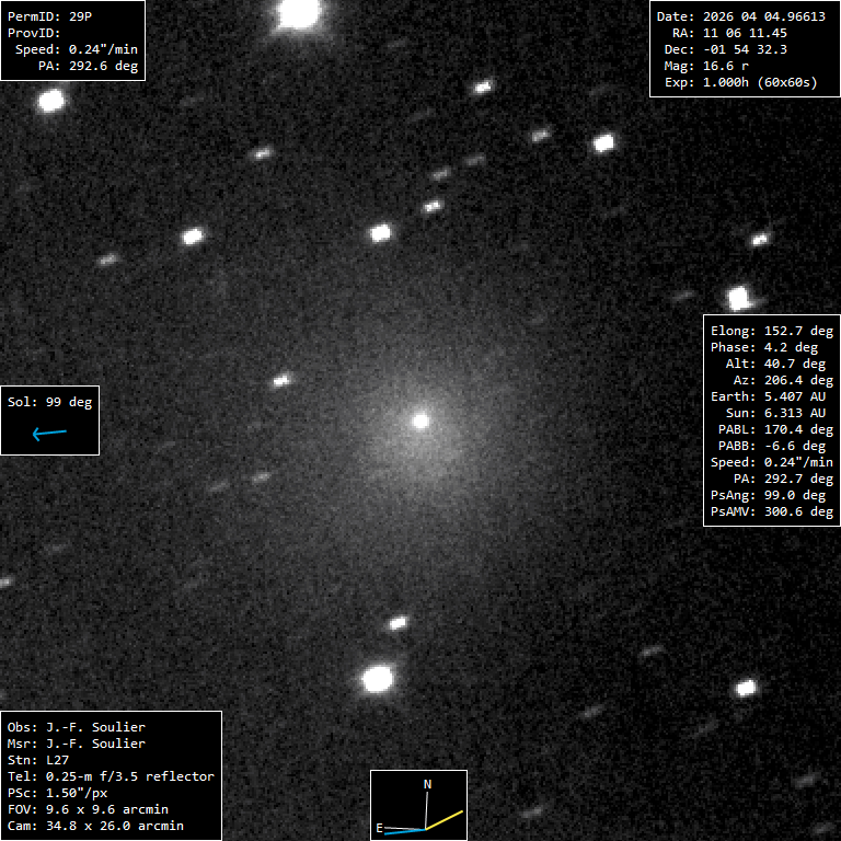 (Copyright Jean-Francois Soulier)Nuclear magnitude (m2) 16.6 m2 standard deviation 0.1 Aperture radius used for m2 6.75 " r (dist/Sun) 6.313 AU d (dist/Earth) 5.401 AU Right ascension 11 06 13.11 h m s Declination -01 54 42.3 ° ' " MPC report COD L27