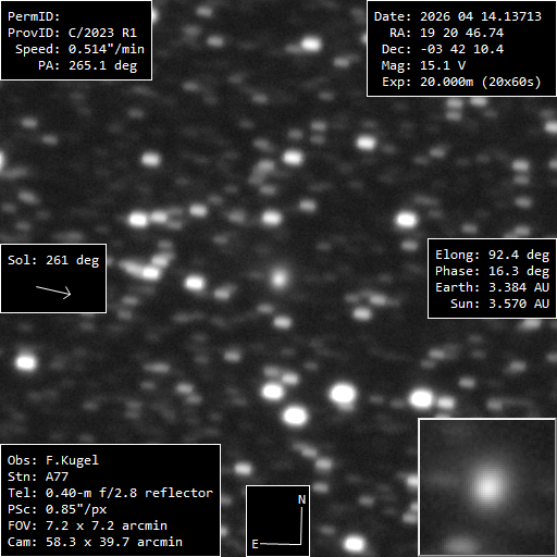 (Copyright Francois Kugel)Nuclear magnitude (m2) 15 m2 standard deviation 0.1 Aperture radius used for m2 5.95 " r (dist/Sun) 3.570 AU d (dist/Earth) 3.387 AU Right ascension 19 20 46.97 h m s Declination -03 42 10.1 ° ' " MPC report COD A77