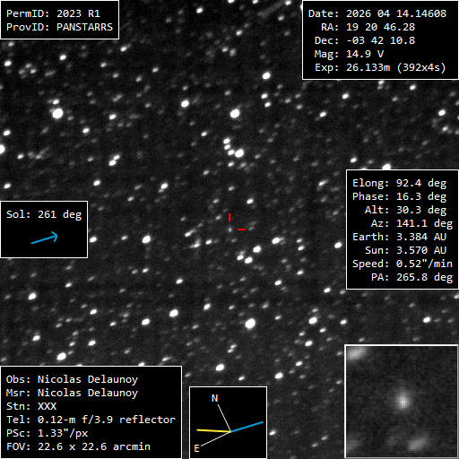(Copyright Nicolas Delaunoy)Nuclear magnitude (m2) 14.9 Aperture radius used for m2 6.1 " r (dist/Sun) 3.570 AU d (dist/Earth) 3.384 AU Right ascension 19 20 46.28 h m s Declination -03 42 10.8 ° ' " Instrumental configuration Config1 Instrument UNISTELLAR eQuinox2 Instrument type Newton Instrument aperture (0=naked eye) 115 mm Instrument focale length 450 mm Instrument focale/diameter 3.91 Filter(s) None Camera IMX347 Sensor CMOS Sensor size 7.1x5.3 mm2 mm2 Sensor pixels number 2088x1536 Binning 1x1 Mount ALT-AZ Motorization Yes Autoguide No Exposure total time 1568 s Exposure details 392x4s Sky transparency (naked eye max mag) 3.5 Seeing 4 Moon phase 136 ° Moon elongation 52 ° Location Yerres, 91330, France Reference stars catalog UCAC-4 Used softwares Tycho tracker V13.02 master darks avec Siril) Resulting picture sampling (scale) 1.33 "/pix Observation submission date 2026 Apr 14 19h41m25s Observation modification date 2026 Apr 14 19h43m02s