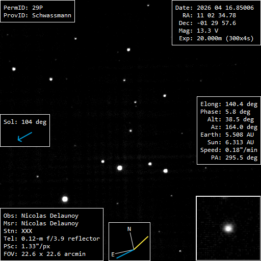 (Copyright Nicolas Delaunoy)Nuclear magnitude (m2) 13.3 Aperture radius used for m2 6.0 " r (dist/Sun) 6.313 AU d (dist/Earth) 5.500 AU Right ascension 11 02 34.78 h m s Declination -01 29 57.6 ° ' " Instrumental configuration Config1 Instrument UNISTELLAR eQuinox2 Instrument type Newton Instrument aperture (0=naked eye) 115 mm Instrument focale length 450 mm Instrument focale/diameter 3.91 Filter(s) None Camera IMX347 Sensor CMOS Sensor size 7.1x5.3 mm2 mm2 Sensor pixels number 2088x1536 Binning 1x1 Mount ALT-AZ Motorization Yes Autoguide No Exposure total time 1200 s Exposure details 300x4s Sky transparency (naked eye max mag) 3.5 Seeing 3 Moon phase 170 ° Moon elongation 149 ° Location Yerres, 91330, France Reference stars catalog UCAC-4 Used softwares Tycho tracker V13.02 master darks avec Siril) Resulting picture sampling (scale) 1.33 "/pix Observation submission date 2026 Apr 17 21h28m57s