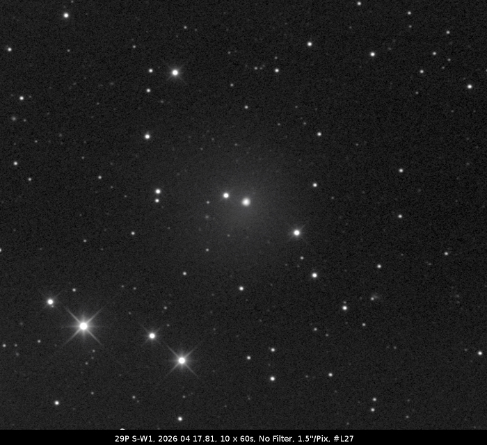 Used softwares Tycho Resulting picture sampling (scale) 1.5 "/pix Remarks or comments Post-outburst Observation submission date 2026 Apr 18 07h07m49s Observation modification date 2026 Apr 18 07h09m11s