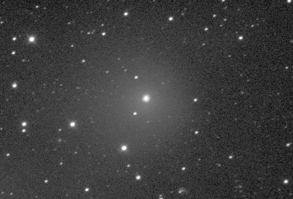 (Copyright Patrick Ditz)Coma Total magnitude (m1) 10.8 Aperture radius used for m1 0.775 ' Nuclear magnitude (m2) 13.4 m2 standard deviation 0.1 Aperture radius used for m2 5.6 " Coma diameter 8 ' r (dist/Sun) 6.313 AU d (dist/Earth) 5.520 AU Right ascension 11 02 05.00 h m s Declination -01 26 15.6 ° ' " MPC report COD K97
