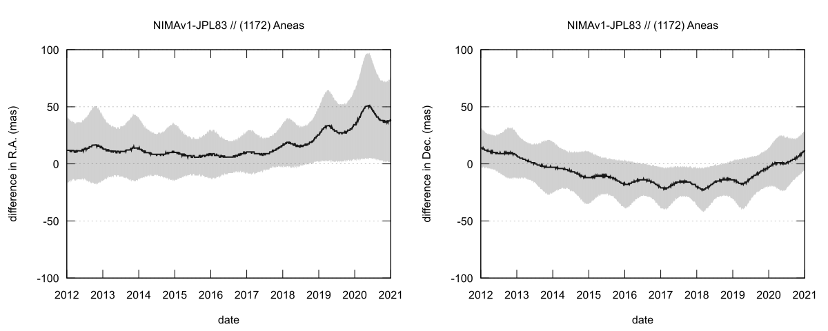 Residuals in right ascension and declination compared to NIMAv1 ephemeris.