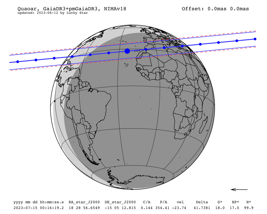 - Each blue dot is spaced by one minute and the big blue dot corresponds to the nominal occultation time (which is the geocentric closest approach);
