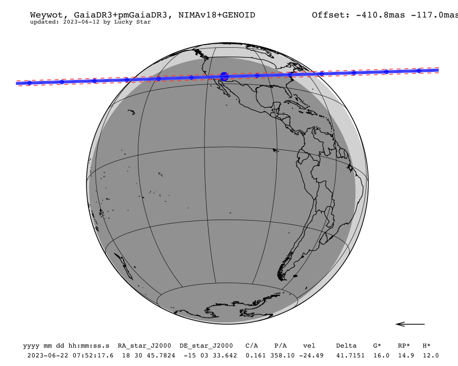 - Each blue dot is spaced by one minute and the big blue dot corresponds to the nominal occultation time (which is the geocentric closest approach);