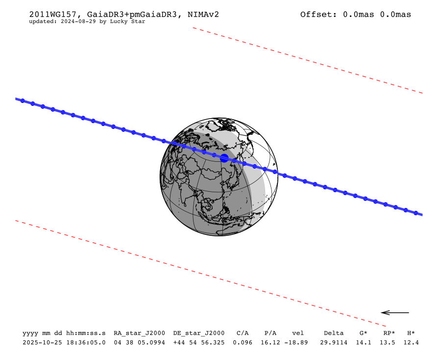 - Each blue dot is spaced by one minute and the big blue dot corresponds to the nominal occultation time (which is the geocentric closest approach);