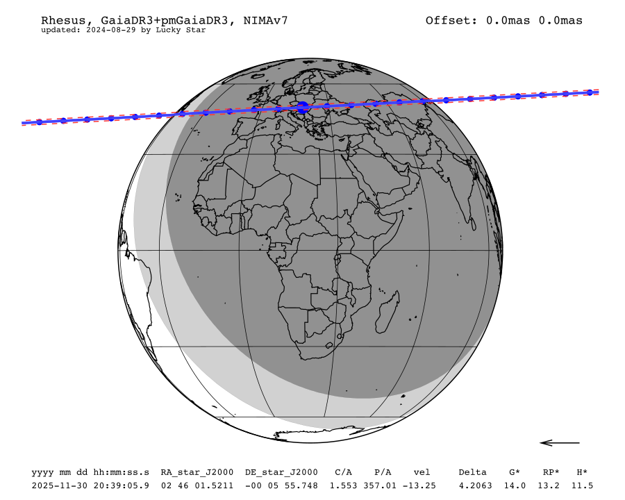 - Each blue dot is spaced by one minute and the big blue dot corresponds to the nominal occultation time (which is the geocentric closest approach);