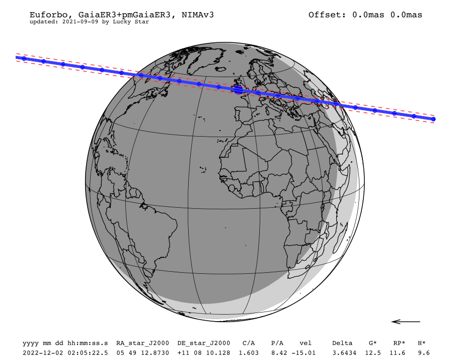 - Each blue dot is spaced by one minute and the big blue dot corresponds to the nominal occultation time (which is the geocentric closest approach);