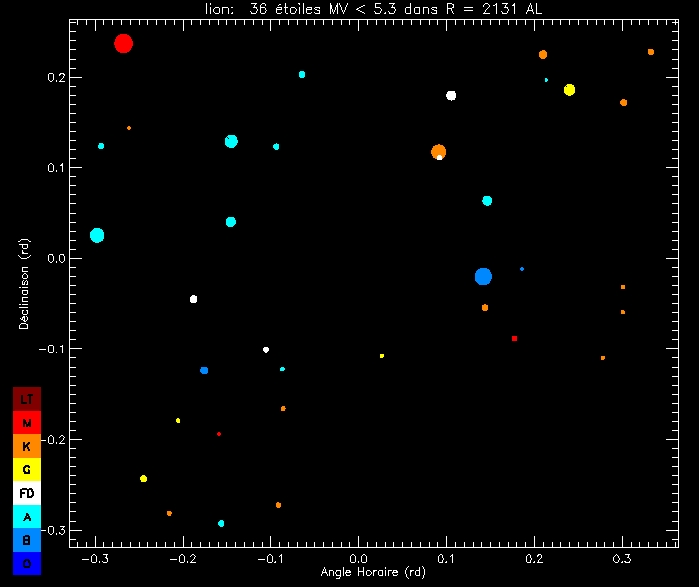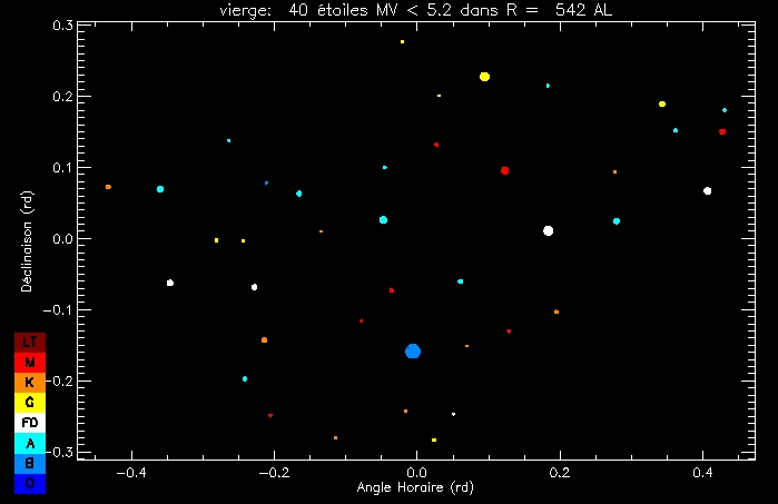 spectral type of stars (color), distance and absolute luminosity in LOG10 (radius