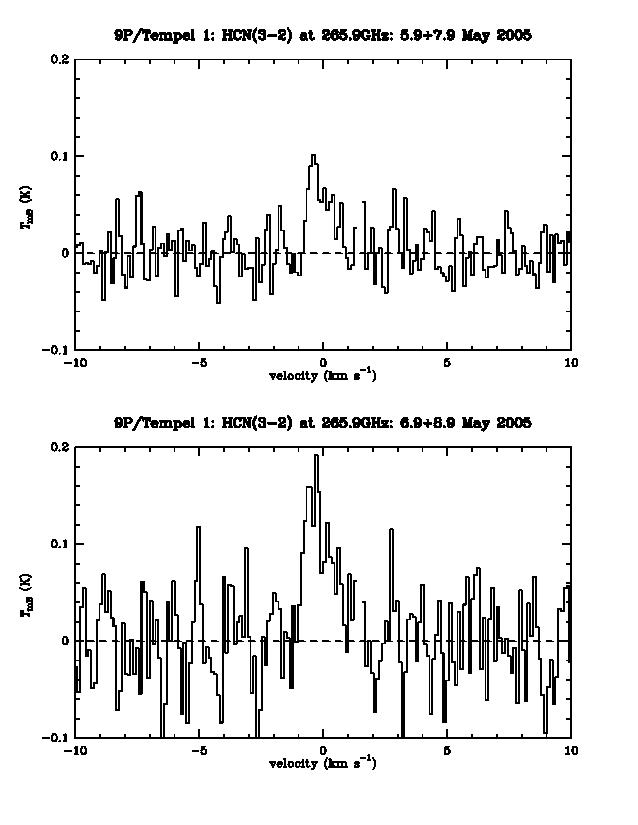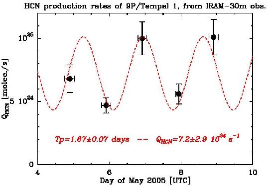 | 2005/05/05.78-09.04 | 1.617 | 0.712 | HCN(3-2) | 111+-8 mKkm/s | -118+-42 m/s | 5.7+-0.4E24 mol./s |