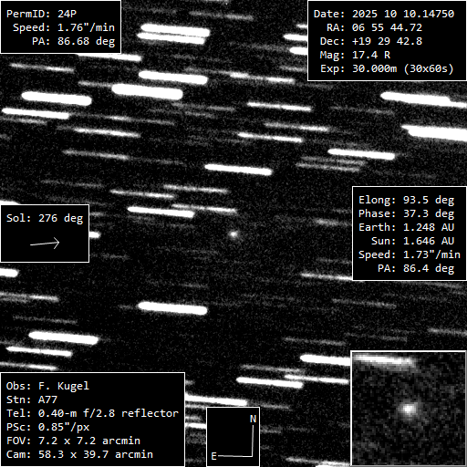 (Copyright Francois Kugel)Nuclear magnitude (m2) 17.7 m2 standard deviation 0.1 Aperture radius used for m2 5.95 " r (dist/Sun) 1.647 AU d (dist/Earth) 1.250 AU Right ascension 06 55 43.30 h m s Declination +19 29 41.7 ° ' " MPC report COD A77