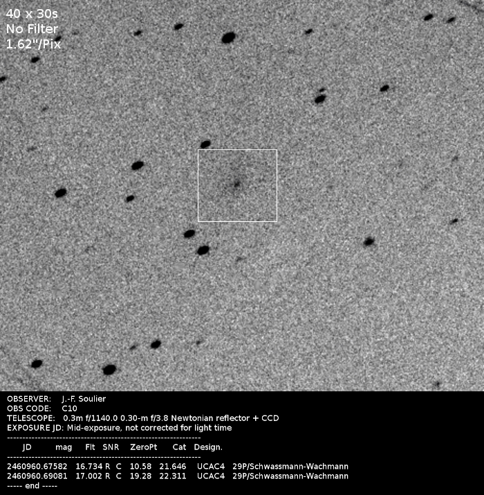 (Copyright Jean-Francois Soulier)Nuclear magnitude (m2) 16.8 Aperture radius used for m2 6.5 " r (dist/Sun) 6.298 AU d (dist/Earth) 7.120 AU Instrument type Newton Instrument aperture (0=naked eye) 300 mm Instrument focale length 1140 mm Instrument focale/diameter 3.8 Filter(s) None Camera ST8 XME Sensor CCD Sensor temperature -20 °C Binning 1x1 Mount F60a Axis Instruments Autoguide No Exposure details 40 x 30s Observatory MPC code C10 Location Seine et Marne Reference stars catalog UCAC-4 Used softwares Astrometrica Resulting picture sampling (scale) 1.62 "/pix Remarks or comments Echant. SETUP Observation submission date 2025 Oct 12 07h37m09s